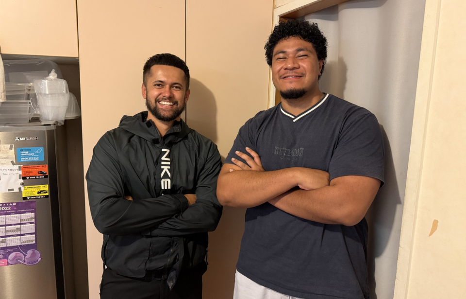 Michael’s friends Callum Sao (left) and Dominic Tekori (right) are helping Michael post every day on social media. Photo: Benjamin Wickers