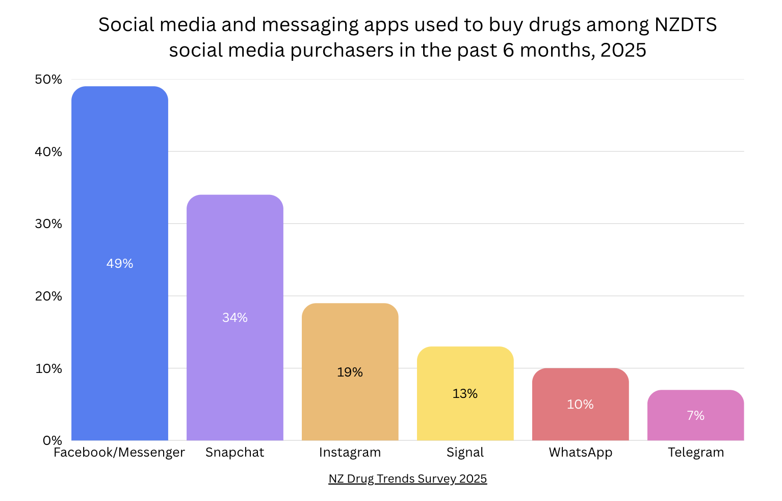 While Facebook/Messenger is most widely used in New Zealand, Snapchat use was used by 34% of survey respondents to purchase drugs.